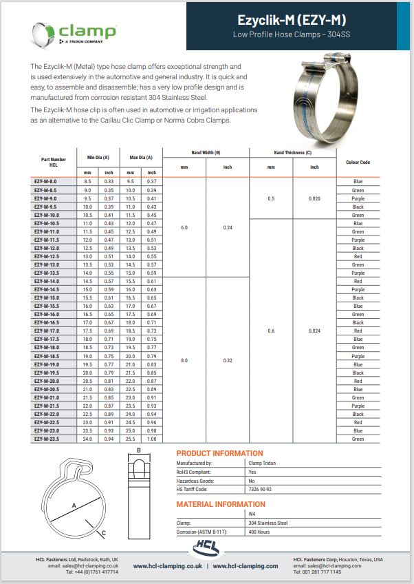 Hadicová spona typu Ezyclik®-M (kovová) nabízí výjimečnou pevnost a je široce používána v automobilovém a obecném průmyslu. Je rychlá a snadná na montáž i demontáž; má nízkoprofilový design a je vyrobena z korozivzdorné nerezové oceli. Ezyclik®-M nabízí alternativu k hadicové sponě Clic, často používané v těchto aplikacích. Hadicová spona Ezyclik®-M se často používá v automobilových aplikacích.