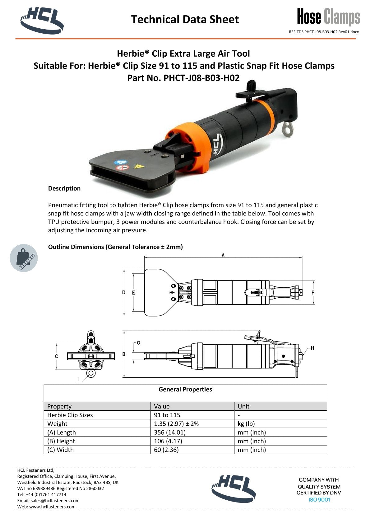 HCL Herbie Clip Hose Clamp Air Tool (Extra Large) - Heavy-Duty Pneumatic Crimping! Master the installation of extra-large Herbie Clips with the specialized HCL Herbie Clip Hose Clamp Air Tool (Part PHCT-J08-B03-H02). Engineered to deliver substantial pneumatic force, this tool guarantees a fast, consistent, and secure crimp on the largest double-tooth Herbie Clips in heavy-duty and industrial environments.