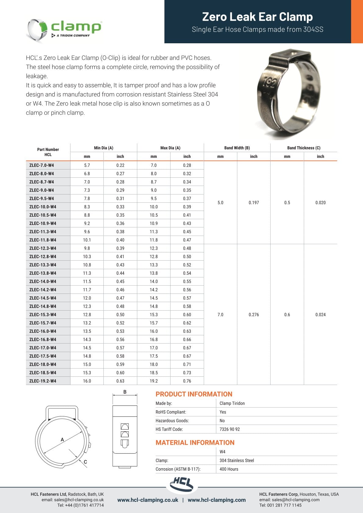 Ohrklemme 7,0 mm breite Zero Leak Ohrklemme O-Clip) von Tridon ist ideal für Gummi- und PVC-Schläuche. Die Schlauchschelle einen vollständigen Kreis, wodurch die Möglichkeit von Leckagen ausgeschlossen ist. Sie lässt sich schnell und einfach montieren, hat ein flaches Design und ist aus korrosionsbeständigem Edelstahl oder W4 gefertigt. Die Zero Leak-Metallschlauchschelle wird manchmal auch als flache Schlauchschelle bezeichnet.