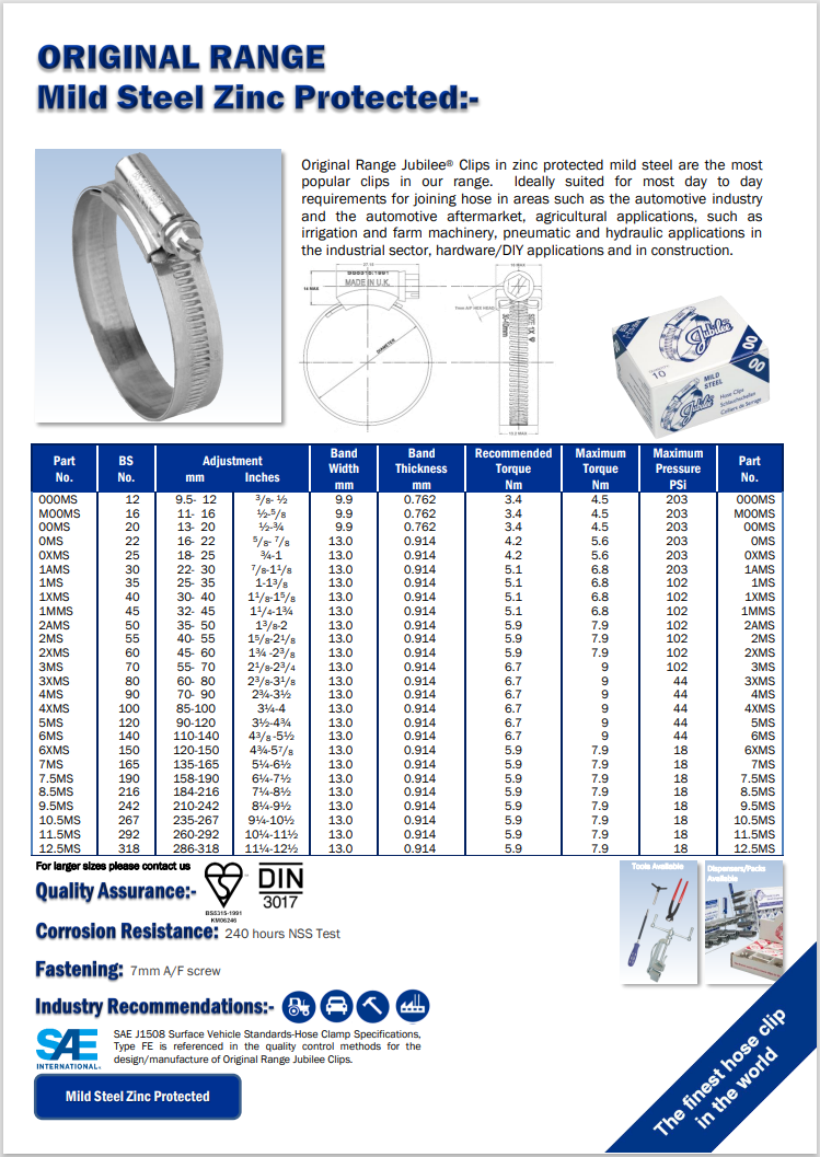 Der originale Jubilee© Clip, das Produkt, mit dem alles begann! Für die meisten Anwendungen ist diese robuste Schneckenantrieb mehr als geeignet. Erhältlich als Klemme aus verzinktem Weichstahl, bietet dieses Produkt einen guten Korrosionsschutz und verfügt über ein durchgehend mit Gewinde versehenes Band, das zusätzliche Flexibilität bei der Anpassung der Klemme an die richtige Größe ermöglicht. Das glatte Innenprofil des Bandes und die gerollten Kanten schützen alle Arten von Schläuchen, einschließlich weicher Schläuche aus Gummi oder Silikon. Alle unsere Original-Jubilee©-Clips werden vom British Standards Institute (BSi) unabhängig geprüft und tragen das British Standard Kitemark, das allgemein als der strengste Standard für Schlauchschelle gilt.