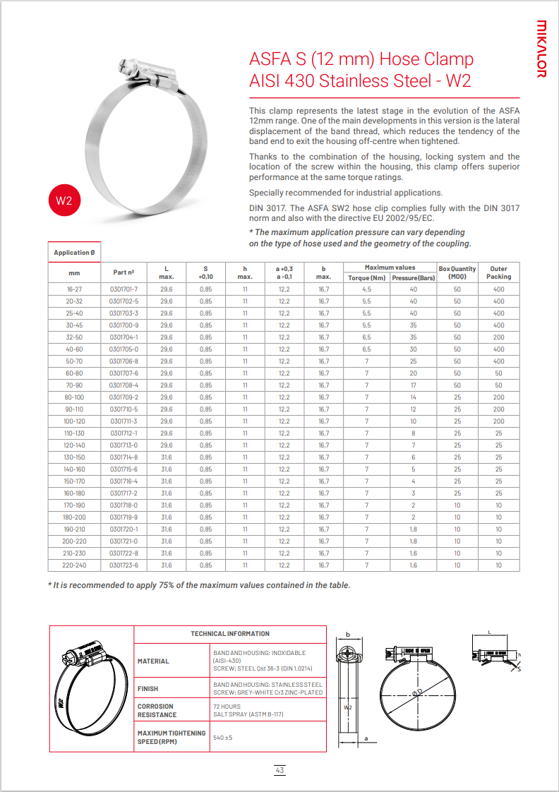 La abrazadera para mangueras ASFA S combina una carcasa innovadora y una banda resistente de 12 mm que, juntas, la convierten en una abrazadera para mangueras de alto rendimiento. La rosca de la banda estampada en frío, suavizada en la parte inferior, combinada con los bordes biselados de la banda, protege la manguera de cualquier daño. El acabado de acero inoxidable (AISI-430) de la banda y la carcasa la convierten en una abrazadera extremadamente atractiva. * La presión máxima de aplicación puede variar en función del tipo de manguera utilizada y de la geometría del acoplamiento. Patentado en todo el mundo.