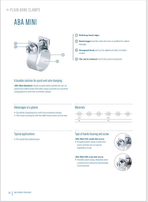 La abrazadera ABA Mini Standard es especialmente adecuada para su uso en mangueras pequeñas y de paredes finas. Esta pequeña abrazadera proporciona una excelente fuerza de sujeción, muy superior a la de las abrazaderas sin tornillos. El tornillo de ranura cruzada ABA Mini permite el uso de diversas herramientas de instalación.