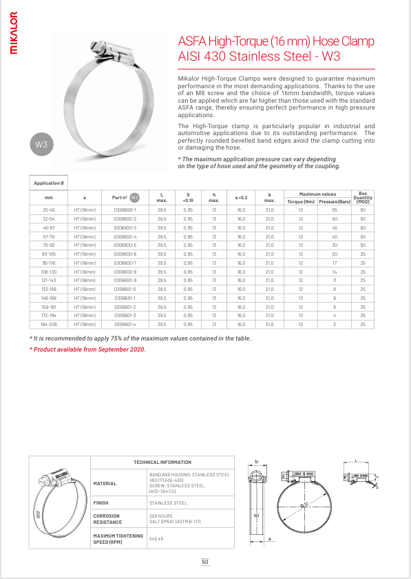 Mikalor High-Torque Clamps were designed to guarantee maximum performance in the most demanding applications. Thanks to the use of an M8 screw and the choice of 16mm bandwidth, torque values can be applied which are far higher than those used with the standard ASFA range, thereby ensuring perfect performance in high-pressure applications.