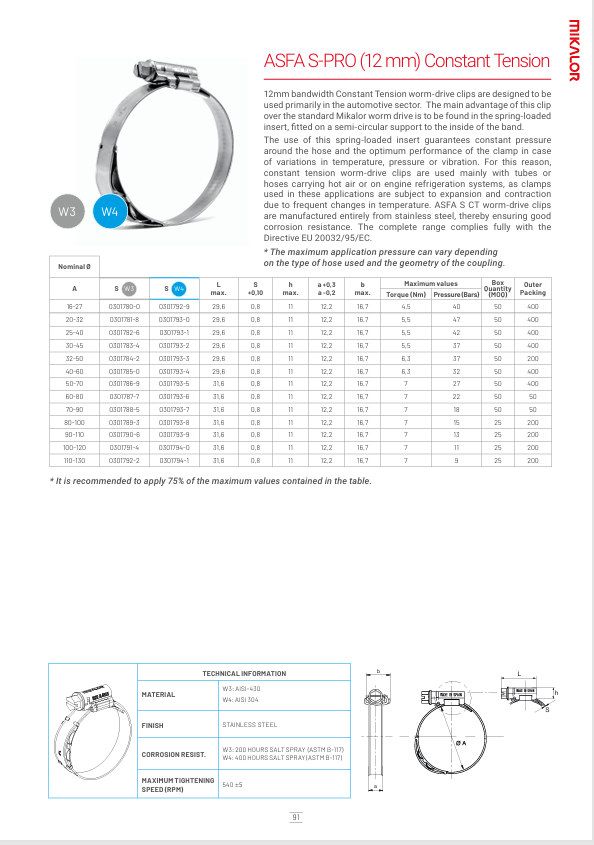 transportant de l'air chaud ou sur les systèmes de refroidissement des moteurs, car les colliers utilisés dans ces applications sont soumis à des dilatations et des contractions dues à des changements fréquents de température. Les colliers à vis sans fin ASFA S CT sont entièrement fabriqués en acier inoxydable, ce qui leur confère une bonne résistance à la corrosion