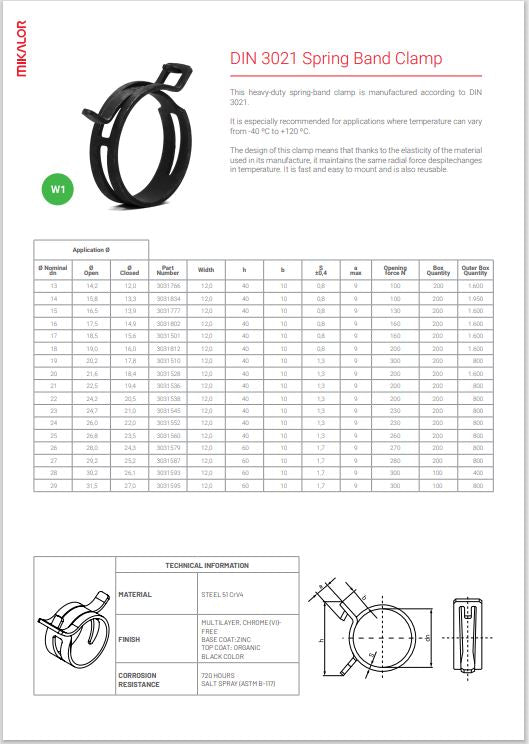 Ez a nagy teherbírású rugós szorítóbilincs a DIN 3021 szabvány szerint gyártott. Különösen ajánlott olyan alkalmazásokhoz, ahol a hőmérséklet -40 ºC és +120 ºC között változhat. A szorítóbilincs kialakítása révén a gyártásához használt anyag rugalmasságának köszönhetően a hőmérséklet-változások ellenére is megőrzi azonos radiális erejét. Gyorsan és egyszerűen felszerelhető, valamint újrafelhasználható.