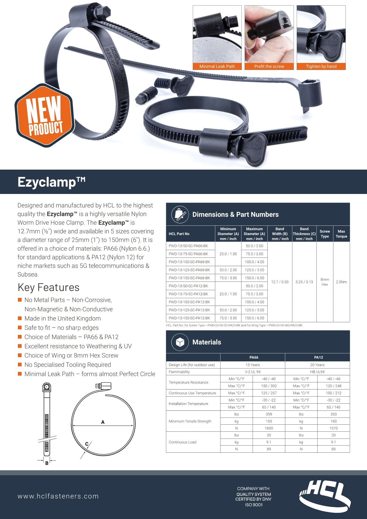 Az Ezyclamp™ egy rendkívül sokoldalú, nylon csavaros tömlőbilincs, amelyet a HCL tervezett és gyártott a legmagasabb minőségi követelményeknek megfelelően. Az Ezyclamp™ szélessége 12,7 mm (½”), és 5 méretben kapható, amelyek átmérőjük 25 mm (1”) és 150 mm (6”) között mozog. Különböző anyagokból készül: PA66 (Nylon 6.6.) standard és magasabb hőmérsékletű alkalmazásokhoz, valamint PA12 (Nylon 12) fokozott UV-ellenállással speciális piacokhoz, például 5G távközléshez és tengeralatti alkalmazásokhoz.