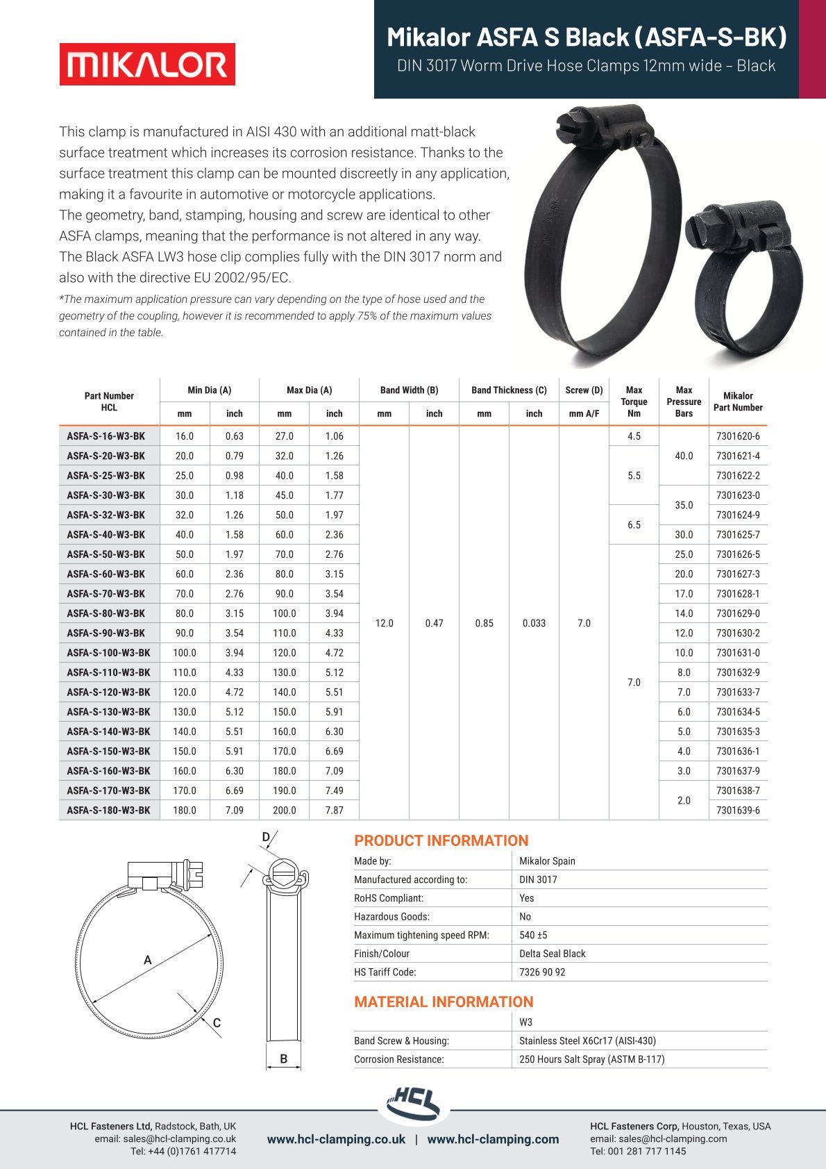 Questo morsetto largo 12,0 mm è prodotto da Mikalor in AISI 430 con un trattamento superficiale aggiuntivo nero opaco che ne aumenta la resistenza alla corrosione. Grazie al trattamento superficiale, questo morsetto può essere montato in modo discreto in qualsiasi applicazione, rendendolo uno dei preferiti nelle applicazioni automobilistiche o motociclistiche. La geometria, la fascia, la stampatura, l'alloggiamento e la vite sono identici agli altri morsetti ASFA, il che significa che le prestazioni non vengono alterate in alcun modo. DIN 3017. La fascetta stringitubo ASFA LW3 nera è pienamente conforme alla DIN 3017 e alla direttiva UE 2002/95/CE.