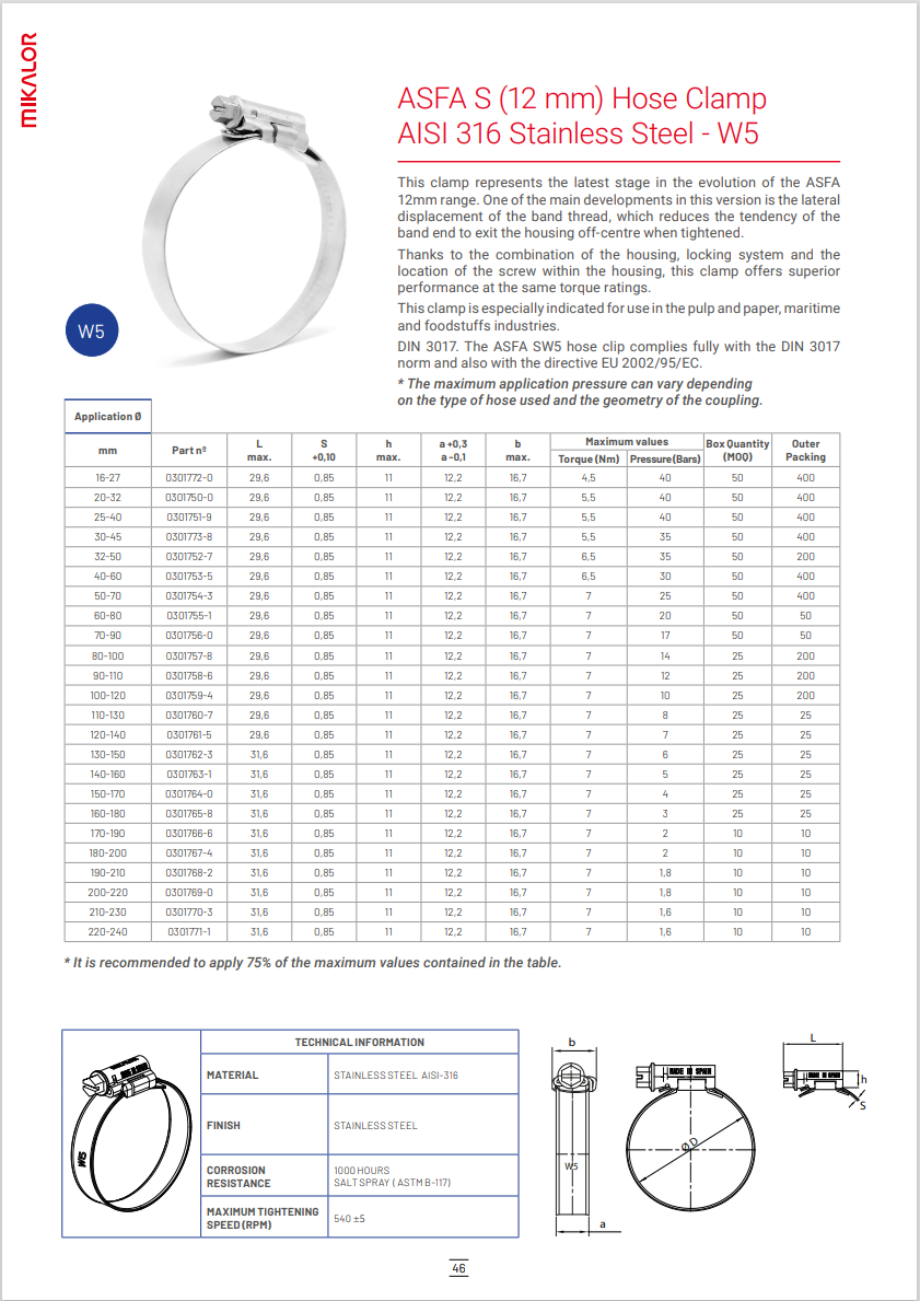 DIN 3017. La fascetta stringitubo ASFA SW5 è pienamente conforme alla DIN 3017 e alla direttiva UE 2002/95/CE.