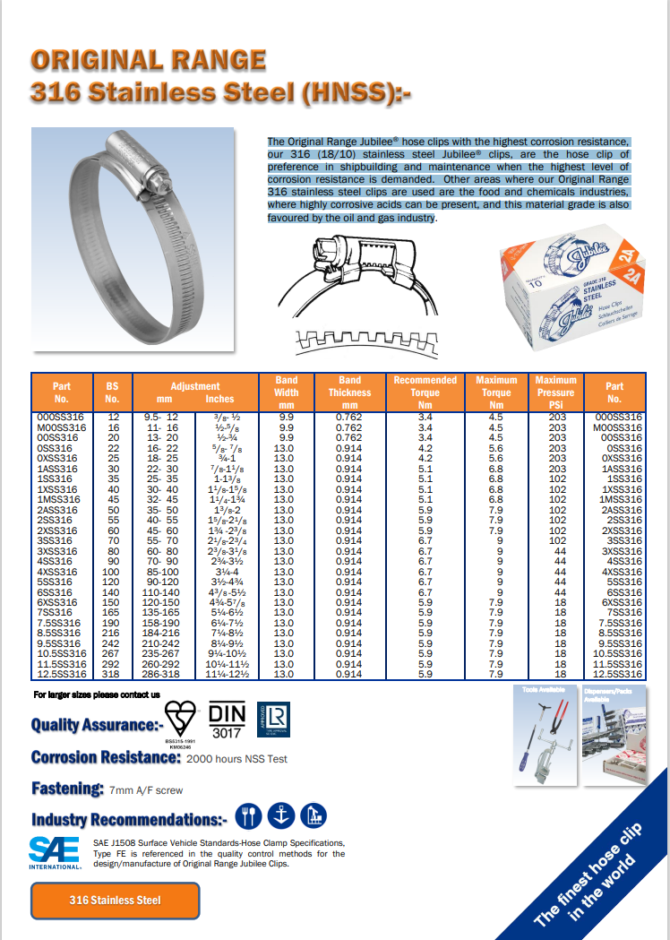 Le fascette per tubi flessibili Original Range Jubilee® con la massima resistenza alla corrosione, le fascette Jubilee® in acciaio inossidabile 316 (18/10), sono le fascette preferite nella costruzione navale e nella manutenzione quando è richiesto il massimo livello di resistenza alla corrosione. Altri settori in cui vengono utilizzate le nostre fascette in acciaio inossidabile 316 della gamma Original Range sono l'industria alimentare e chimica, dove possono essere presenti acidi altamente corrosivi, e questo tipo di materiale è preferito anche dall'industria petrolifera e del gas.