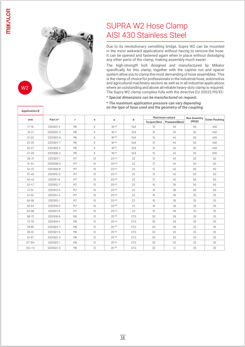 Seria Supra stanowi naturalną ewolucję W1 Super W1 . Dzięki rewolucyjnemu obrotowemu mostkowi zacisk Supra może być montowany w najbardziej niewygodnych miejscach bez konieczności zdejmowania węża. Można go otworzyć i ponownie zamocować bez konieczności demontażu innych części zacisku, co znacznie ułatwia montaż. Dzięki fazowanym krawędziom wąż jest chroniony przed uszkodzeniem.