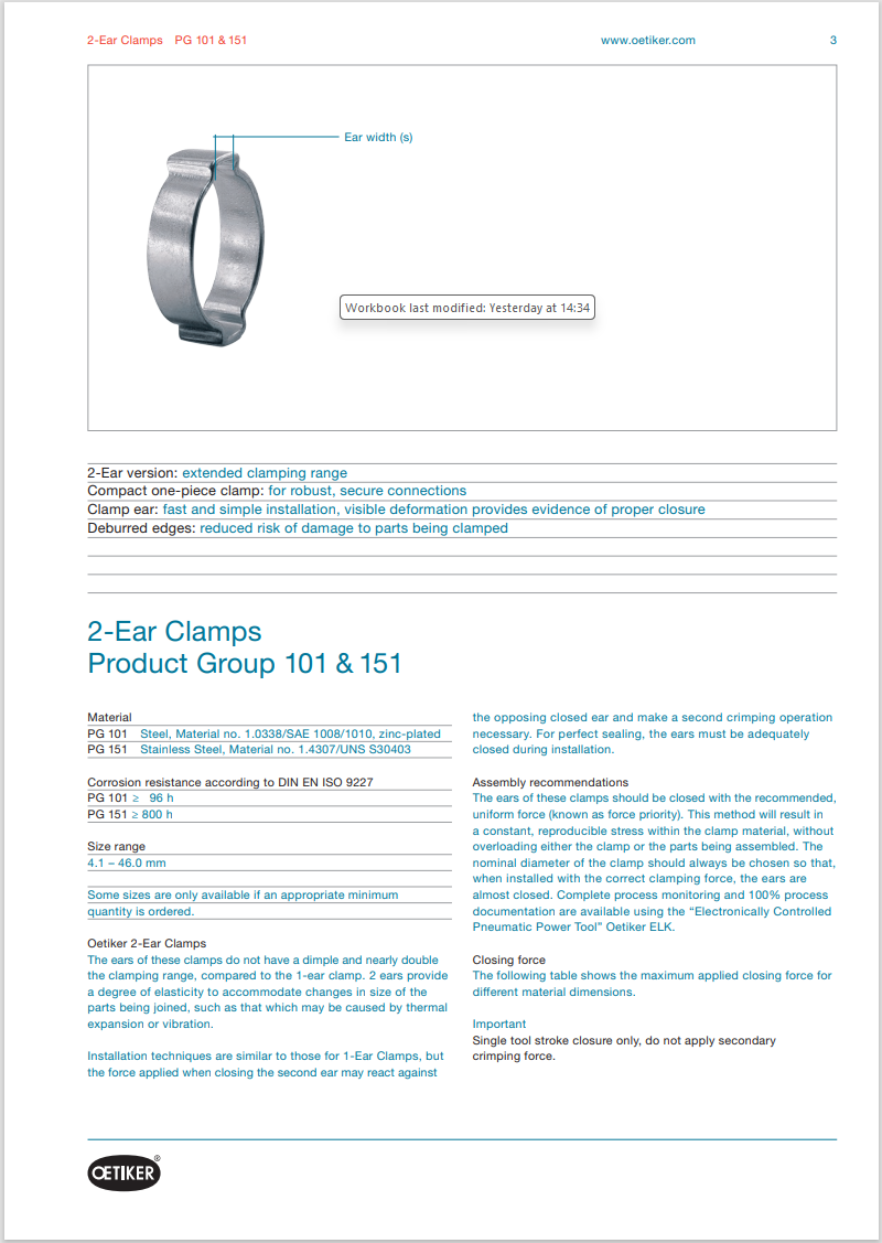 nominal diameter of the clamp should always be chosen so that, when installed with the correct clamping force, the ears are almost closed.