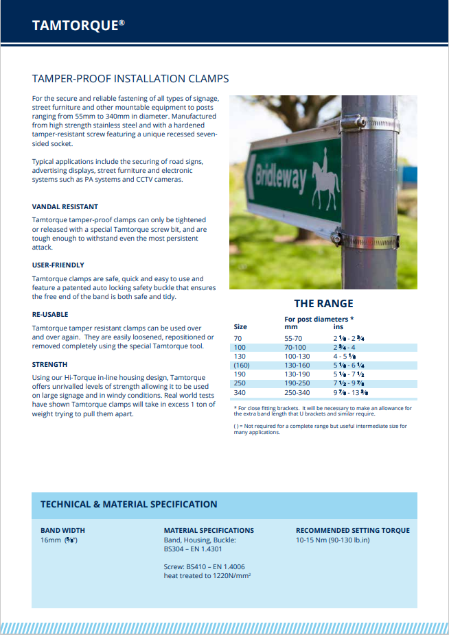 Opaski zaciskowe JCS z perforowanym ślimakiem o szerokości 16 mm to odporne na manipulacje opaski montażowe służące do bezpiecznego i niezawodnego mocowania wszelkiego rodzaju oznakowań, elementów małej architektury i innych urządzeń montowanych na słupach o średnicy od 55 mm do 340 mm. Wykonane są z wytrzymałej stali nierdzewnej i wyposażone w hartowaną, odporną na manipulacje śrubę z unikalnym, wpuszczanym siedmiokątnym gniazdem. Typowe zastosowania obejmują mocowanie znaków drogowych, reklam, małej architektury oraz systemów elektronicznych, takich jak systemy nagłośnieniowe i kamery CCTV.
