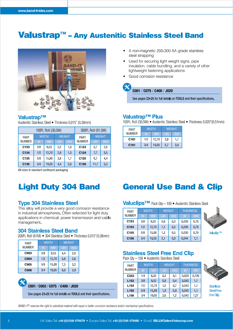 Valustrap is a non-magnetic 200-300 AA grade stainless steel strapping used for securing light weight signs, pipe insulation, cable bundling, and a variety of other lightweight fastening applications. 304SS version will provide a very good corrosion resistance in industrial atmospheres. Often selected for light duty applications in chemical, power transmission and cable management.