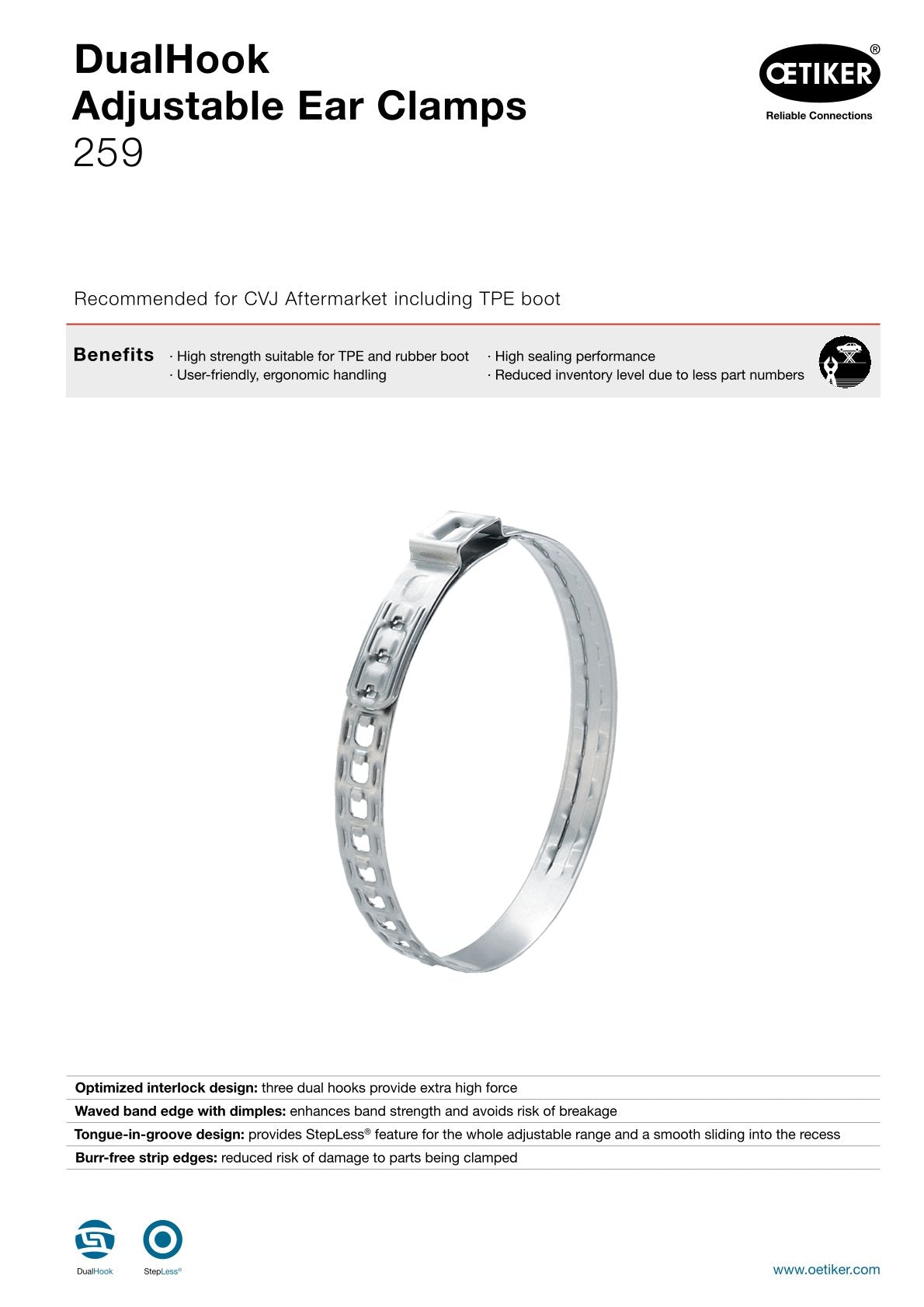 Acest kit Oetiker Expertainer este un kit de 124 de piese care conține noua clemă Dualhook 259 Oetiker Ear Clamp - concepută pentru utilizarea pe articulațiile cu viteză constantă (arbori de transmisie) ale autovehiculelor de pasageri și oferă următoarele caracteristici