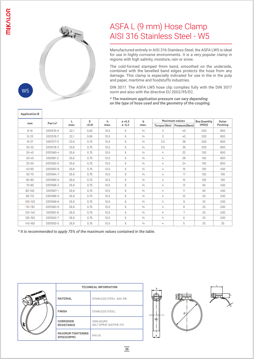 DIN 3017. Clema pentru furtun ASFA LW5 este în deplină conformitate cu DIN 3017 și cu directiva UE 2002/95/CE. Această clemă este ideală pentru aplicații industriale generale.