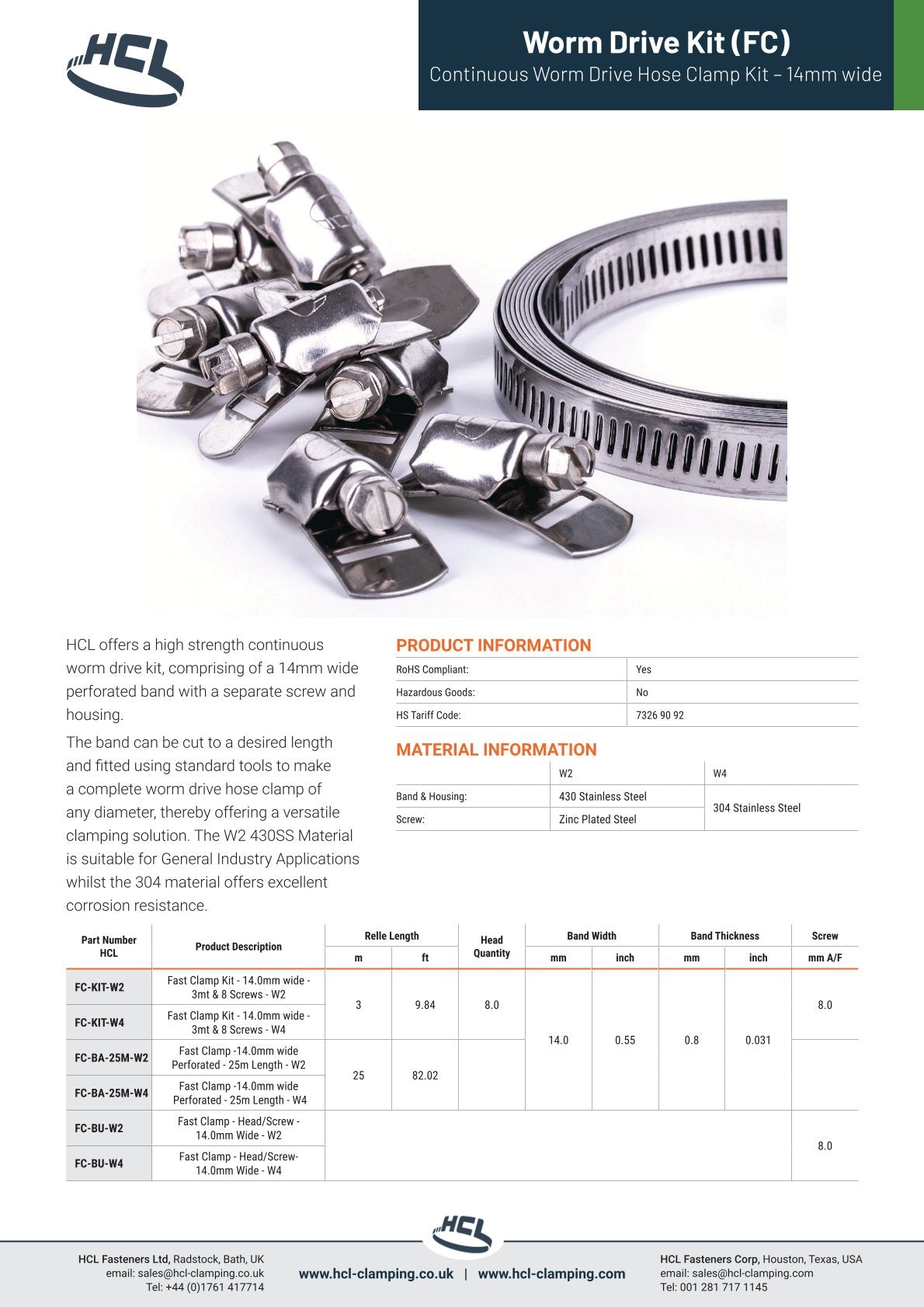 HCL oferă un kit de transmisie cu melc continuu de înaltă rezistență, compus dintr-o bandă perforată cu lățimea de 14 mm, cu șurub și carcasă separate. Banda poate fi tăiată la lungimea dorită și montată folosind scule standard pentru a realiza o clemă completă pentru furtun cu transmisie cu melc de orice diametru, oferind astfel o soluție de prindere versatilă. Materialul W2 este potrivit pentru aplicații generale.
