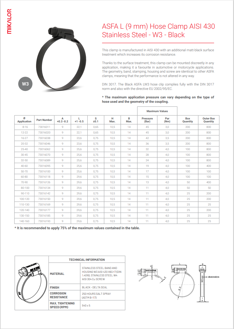 Táto 9,0 mm široká svorka je vyrobená spoločnosťou Mikalor z materiálu AISI 430 s dodatočnou povrchovou úpravou v matnej čiernej farbe, ktorá zvyšuje jej odolnosť proti korózii. Vďaka povrchovej úprave je možné túto svorku diskrétne namontovať v akejkoľvek aplikácii, čo z nej robí obľúbený produkt v automobilovom priemysle a pri výrobe motocyklov. Geometria, páska, lisovanie, puzdro a skrutka sú identické s ostatnými svorkami ASFA, čo znamená, že výkonnosť nie je nijakým spôsobom zmenená. DIN 3017. Čierna hadicová svorka ASFA LW3 je plne v súlade s DIN 3017 a tiež so smernicou EÚ 2002/95/ES.